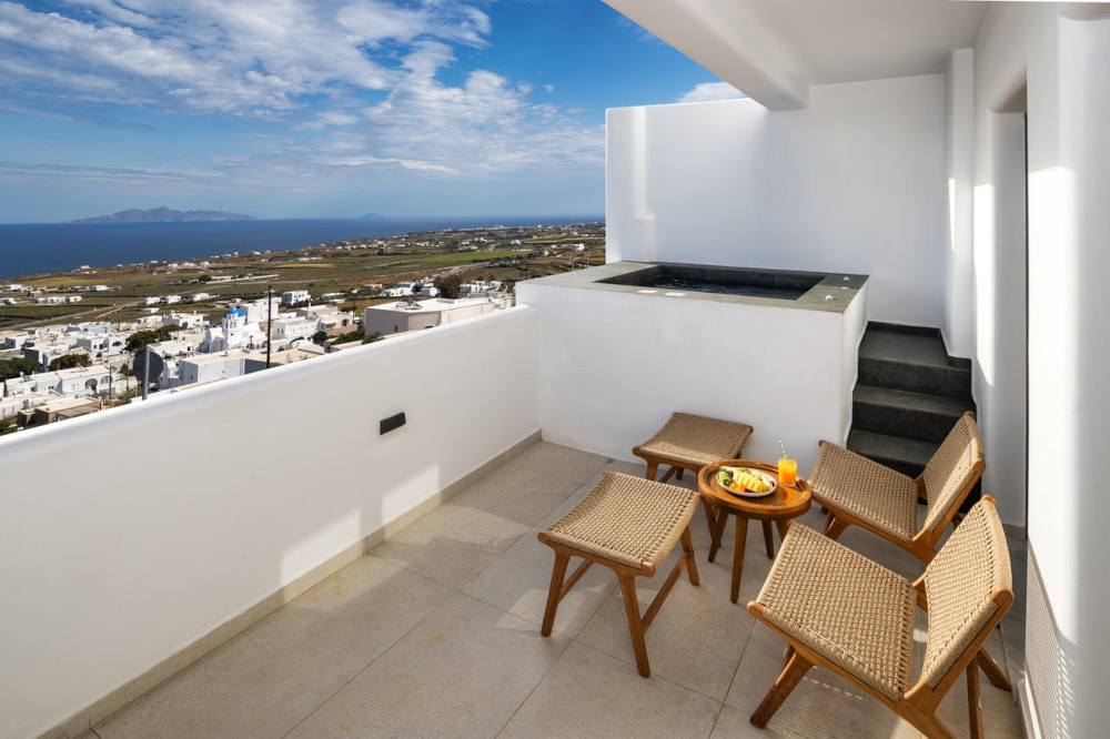A spacious room ideal for couples, with a queen bed, a sofa in the living area and all the comforts that our hotel’s standards offer for all our guests. All Junior Suites with outdoor jacuzzis have furnished balconies with sea views and a private hot tub. The size of the Junior Suites with outdoor jacuzzi is approximately 26 square meters.